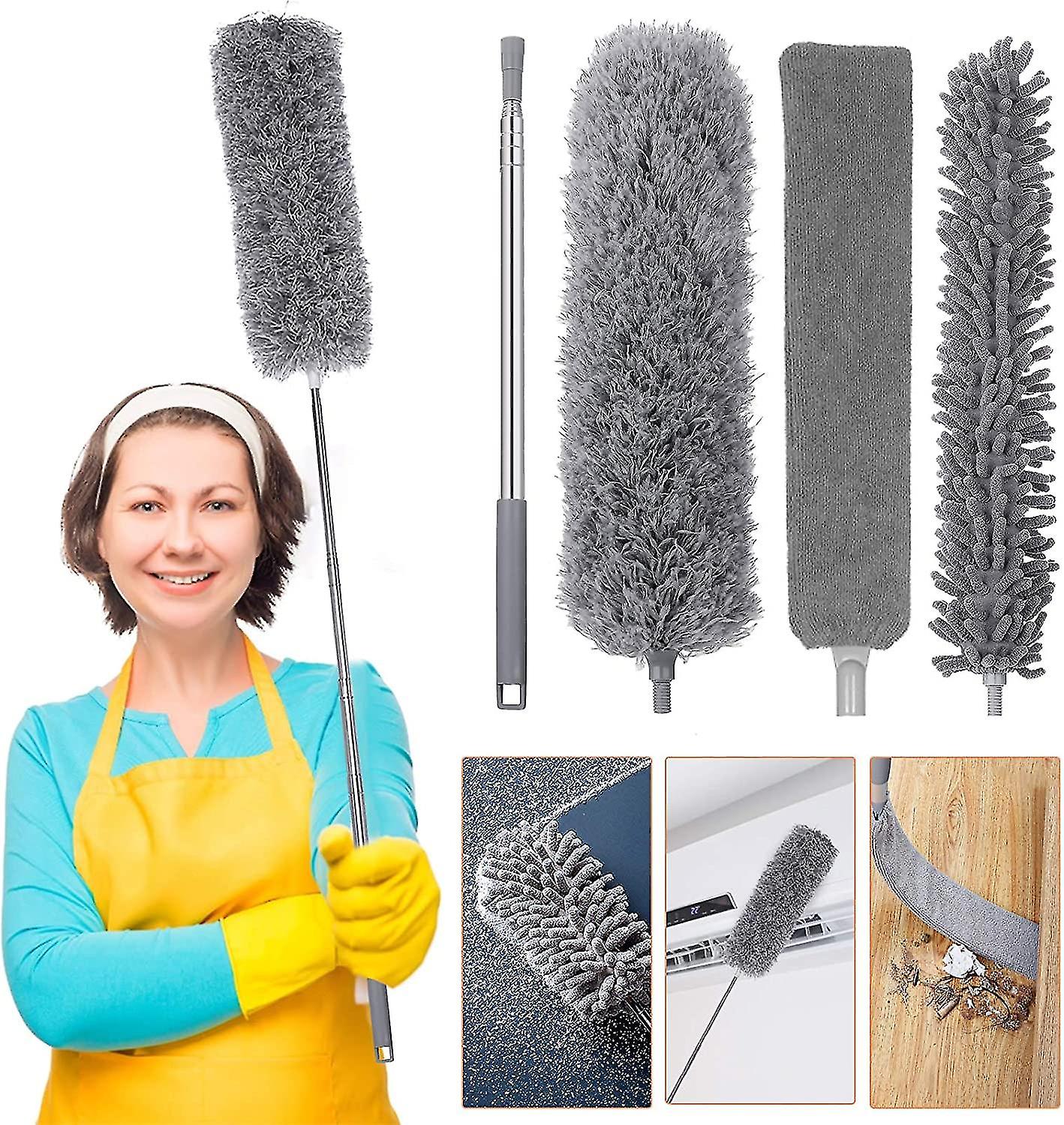 - With 3 replaceable heads, manual dustersl kit can meet most of your cleaning needs. The dustersl head is made of high quality microfiber for cleaning dust and cobwebs from wall corners and chandeliers. Chenille dustersl head is made of wear-resistant chenille and for cleaning dust and hair in cars on windows.