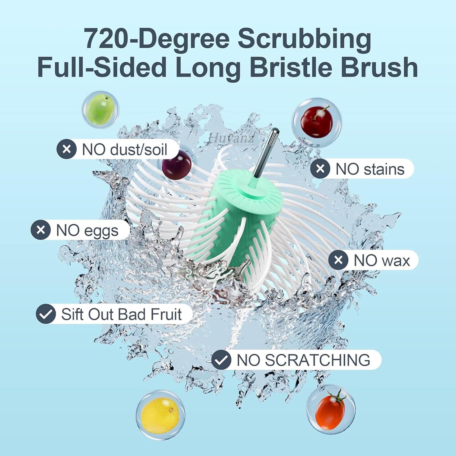 - 【HEALTHY ALL-ROUND CLEANING】The soft TPE sheets and long bristles inside the fruit and vegetable cleaner provide 720-degree all-round cleaning power and will turn each fruit over and over to complete a complete fruit cleaning. The soft, full-sided brush safely removes dust, eggs, soil, wax, stains, and reduces agrochemicals or harmful residue from fruit without damaging the fruit/vegetables. But it is not recommended to try it on berries such as raspberries blackberries strawberries.